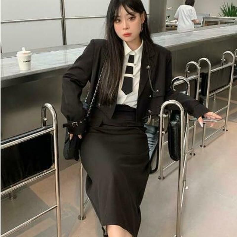 ジャケットに個性的なシャツ、ハイウエスト、ロング丈スカートのスリーピース
