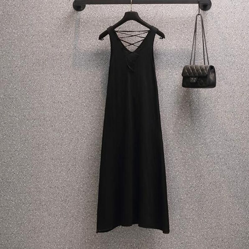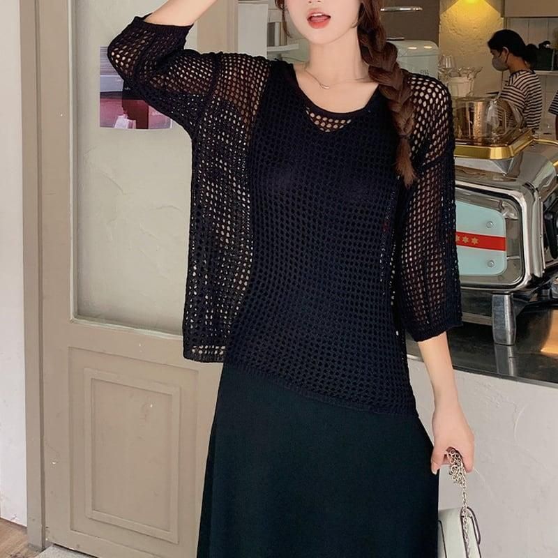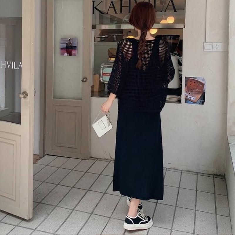 ハイウエストロング丈のノースリーブにメッシュセーターのツーピース