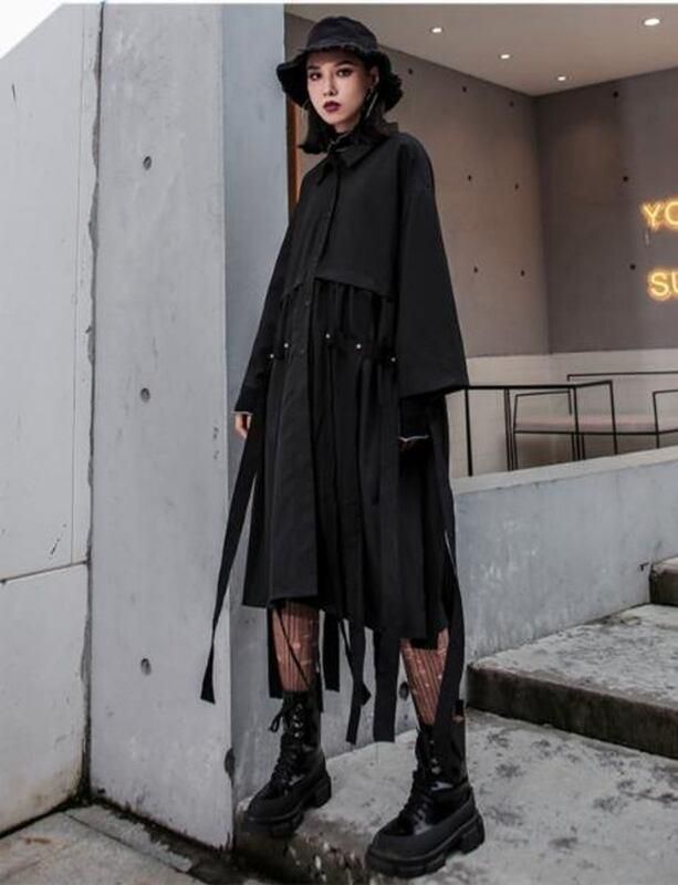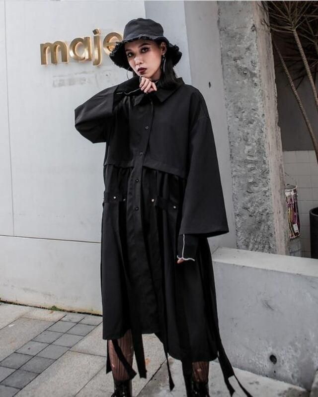 ちょっぴりゴシックな病み可愛さをプラスしたデザイン。スカート裾から伸びるリボンが歩くたびに揺れてエアリーなシルエットが可愛いコートです。さっと羽織るだけでシルエットがカッコよく決まるので一枚持っておくとコーデの幅が広がります。